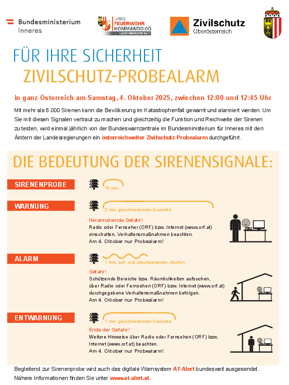 Am ersten Samstag im Oktober, 4. Oktober 2025, wird wieder ein bundesweiter Zivilschutz-Probealarm durchgeführt. Zwischen 12:00 und 12:45 Uhr werden nach dem Signal „Sirenenprobe“ die drei Zivilschutzsignale „Warnung“, „Alarm“ und „Entwarnung“ in ganz Österreich ausgestrahlt. Der Probealarm dient einerseits zur Überprüfung der technischen Einrichtungen des Warn- und Alarmsystems, andererseits soll die Bevölkerung mit diesen Signalen und ihrer Bedeutung vertraut gemacht werden. In den Medien wird während der Proben ständig informiert.